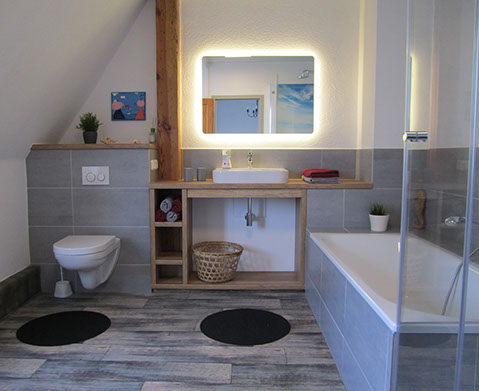 • Bad mit Dusche, Badewanne und WC